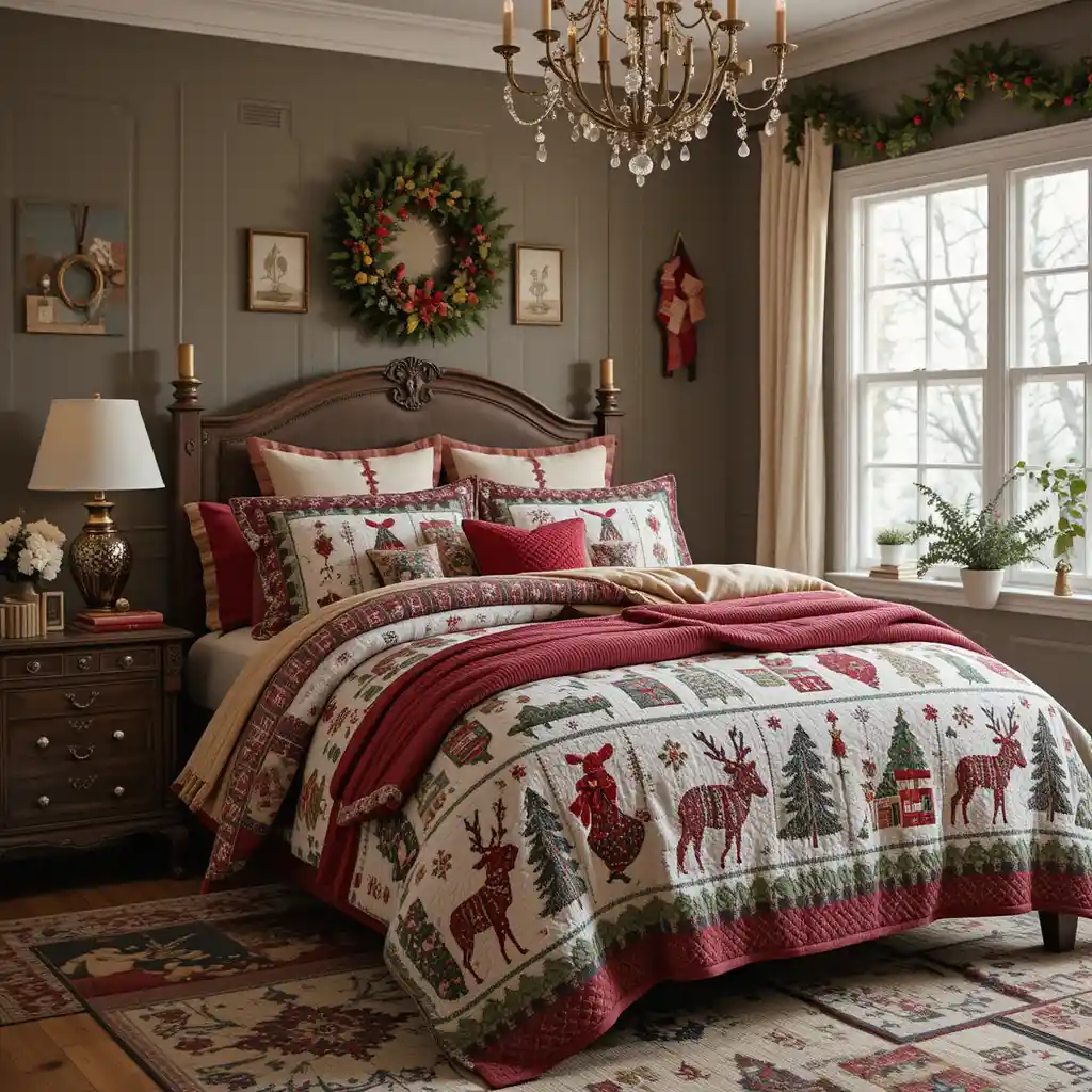 Layering cozy quilts with holiday patterns provides comfort and a festive aesthetic. Rich textures like fleece or knitted throws make the bed feel extra warm for cold December nights.