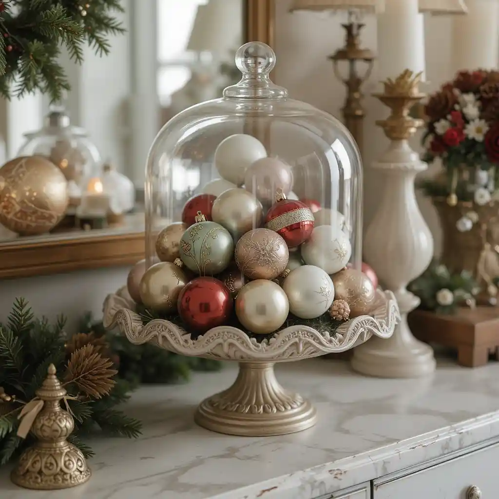 Arrange vintage ornaments in a decorative bowl or glass cloche on your dresser. This timeless detail adds character, history, and elegance to your Christmas bedroom decor ideas.