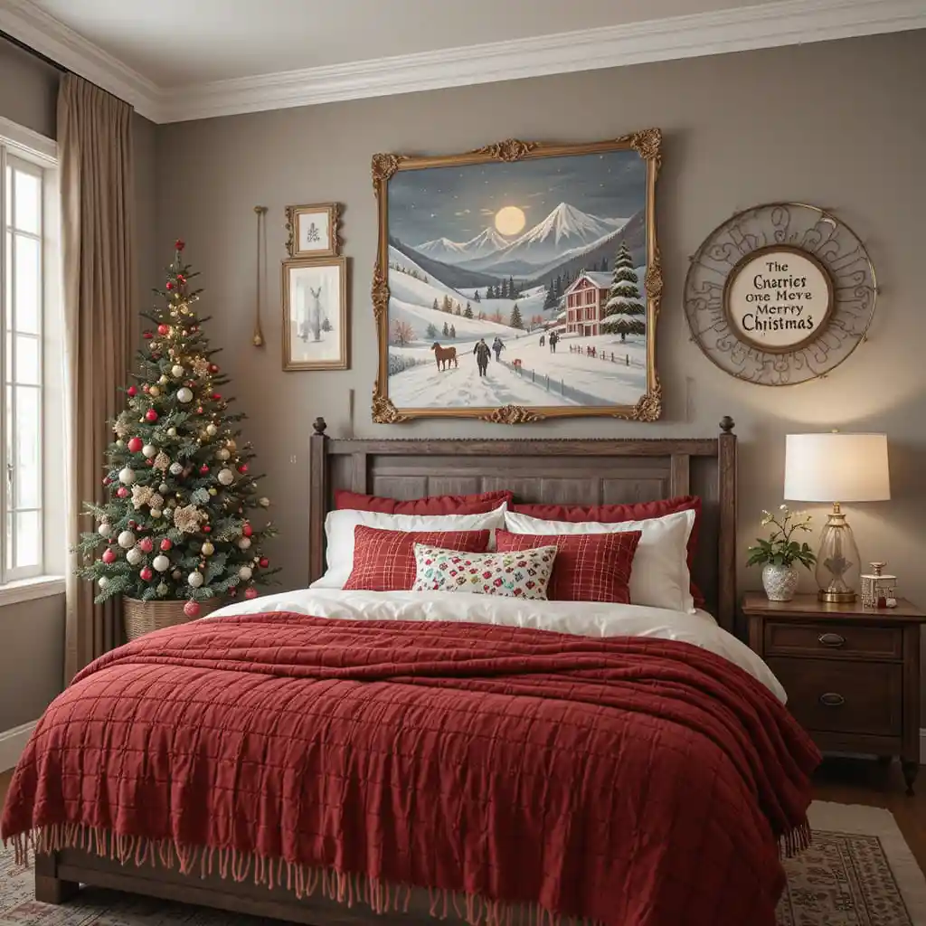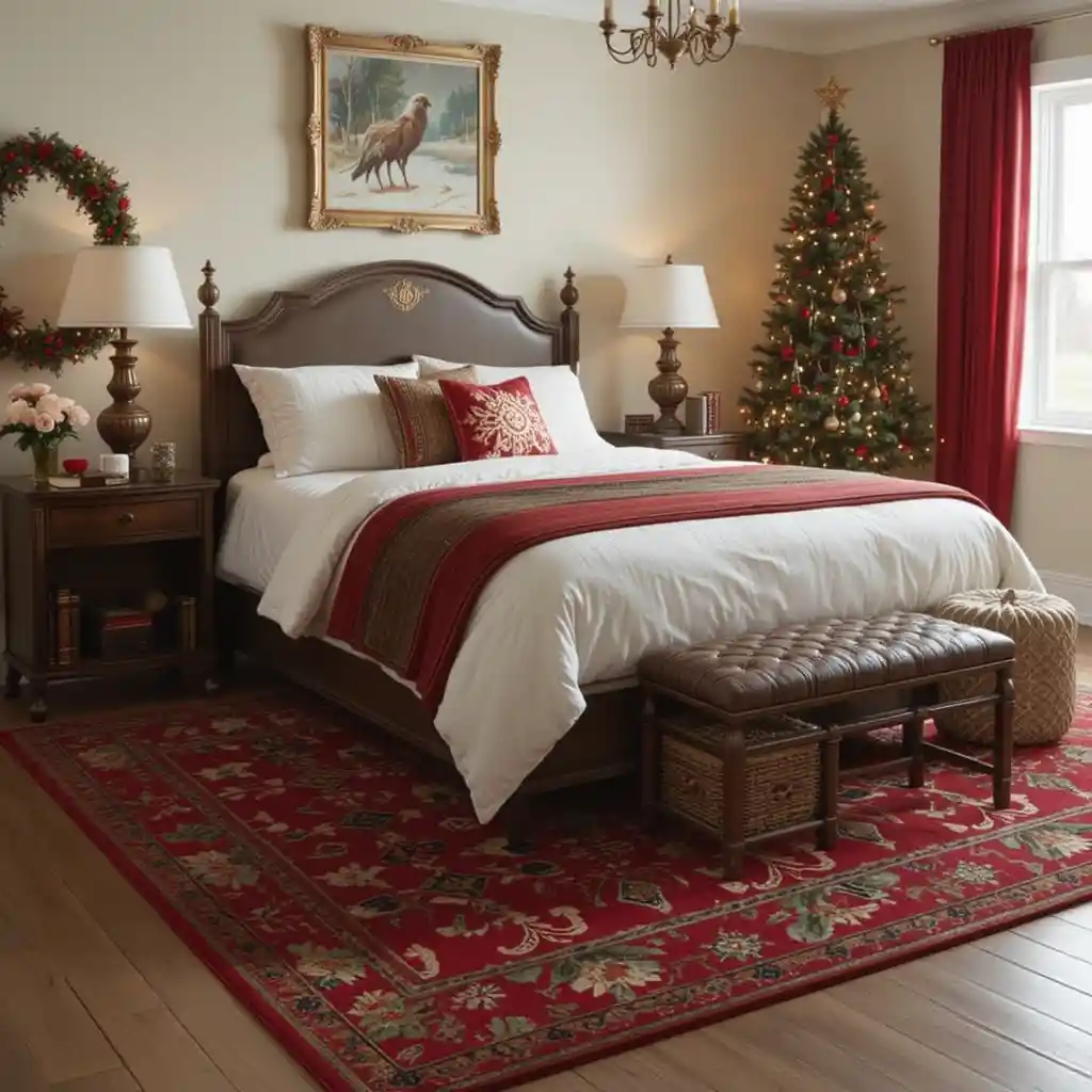 Placing a patterned rug in traditional holiday hues can redefine the entire bedroom atmosphere. It anchors the space with a festive foundation that ties all décor elements together.