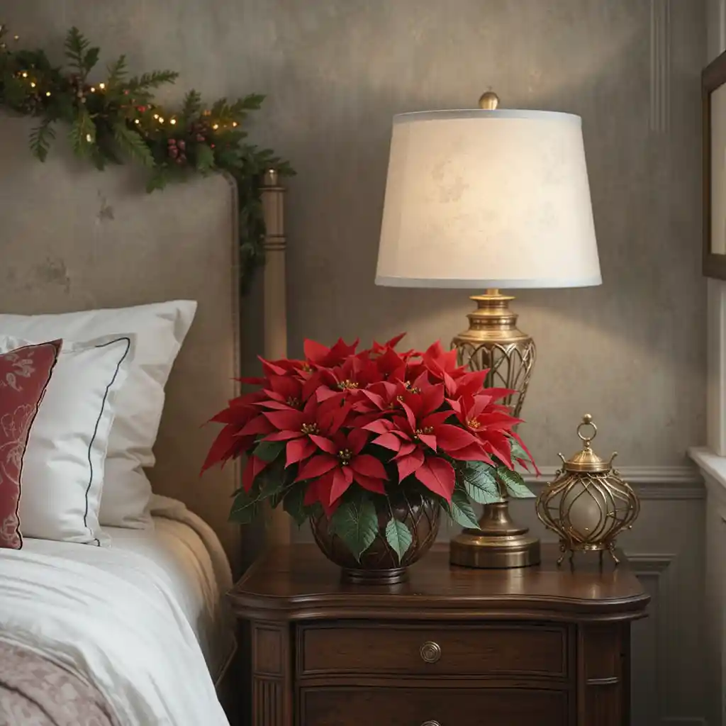 Place a poinsettia plant on a nightstand or dresser to instantly bring holiday color. Their bright red blooms symbolize Christmas tradition and refresh the overall room décor.