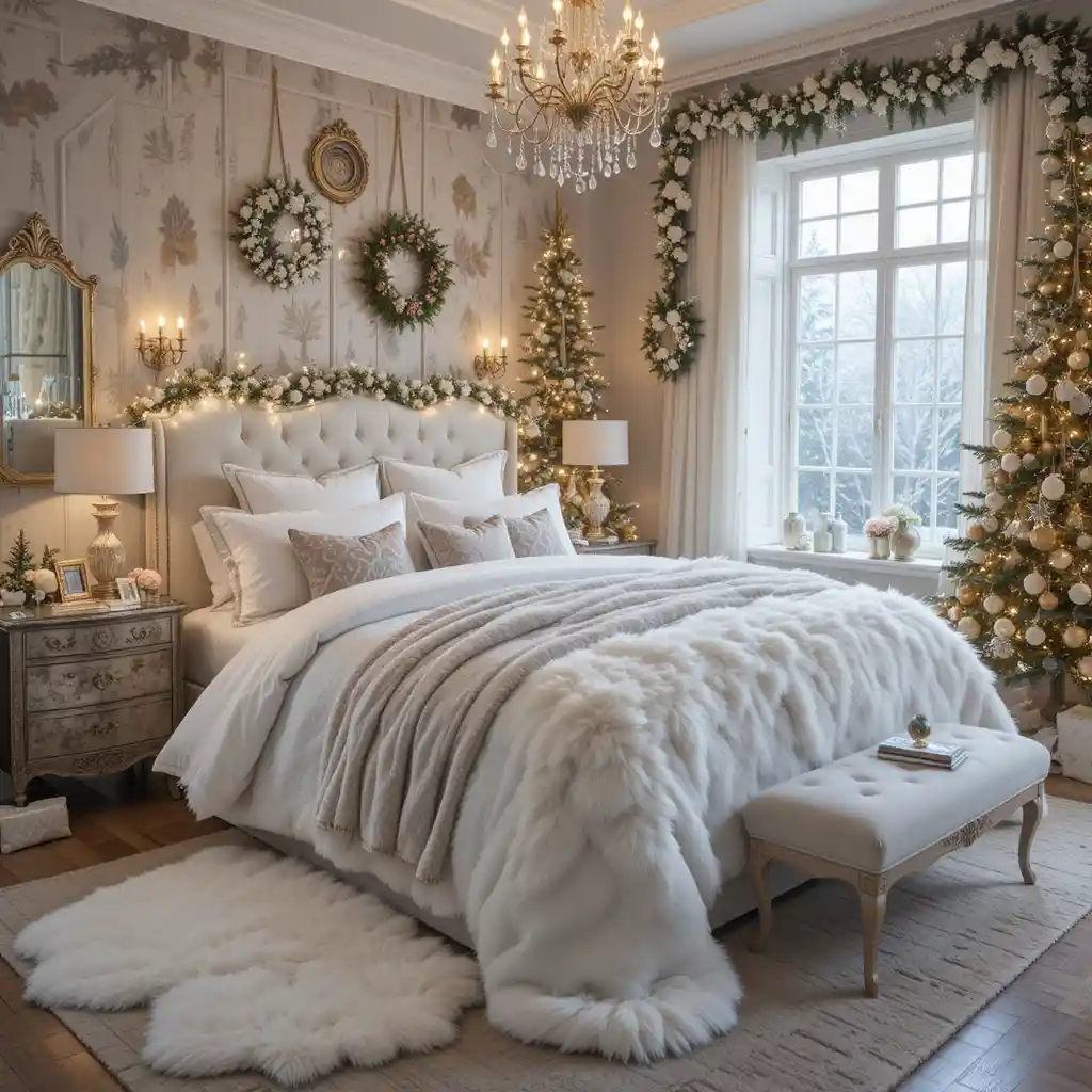 Add a faux fur throw at the end of the bed or a small rug near your bedside. These textures evoke snowy landscapes while giving your bedroom a luxurious holiday feel.