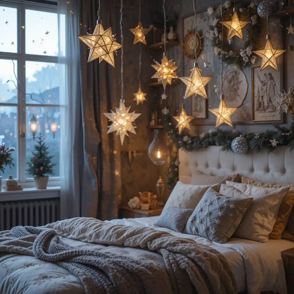Illuminate the room with star-shaped lanterns or pendant lights. Their celestial design enhances the festive theme while casting a warm, cozy radiance at night.