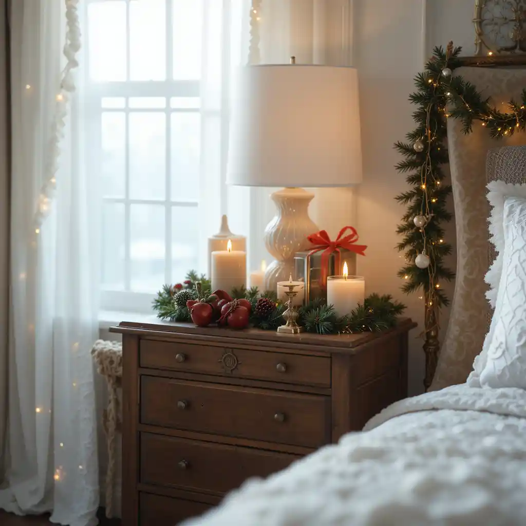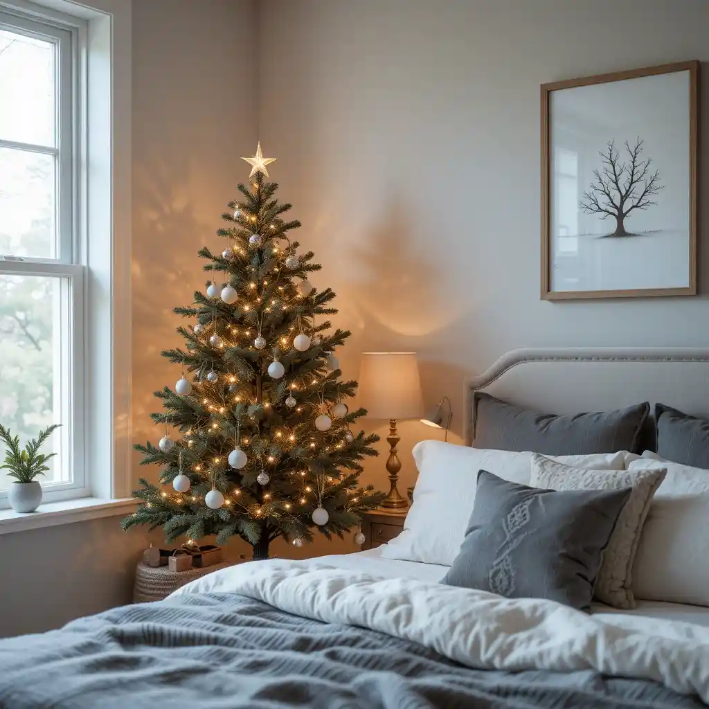 A small, decorated tree instantly transforms the bedroom into a holiday retreat. Opt for subtle ornaments, string lights, and a small star topper to keep it cozy yet impactful.