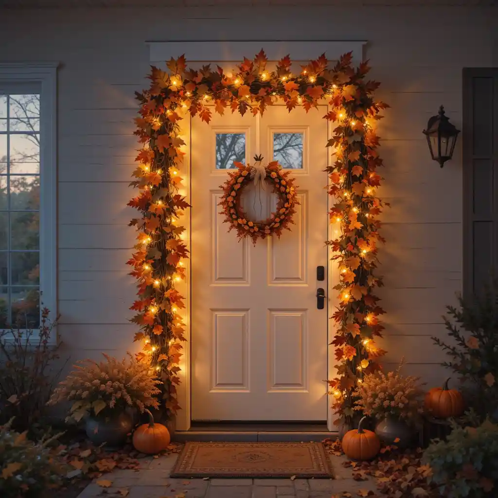 Hang a fall garland over your door and intertwine fairy lights throughout. It will welcome guests with a charming autumn glow before they even step inside.
