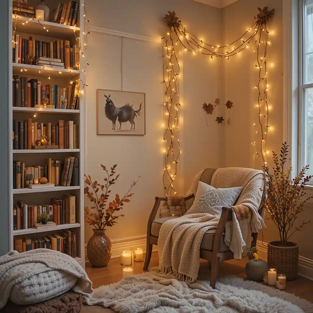 Add fairy lights to a bookshelf or around a reading chair for an intimate, peaceful corner. Pair with soft blankets and autumn-scented candles for the ultimate cozy vibe.
