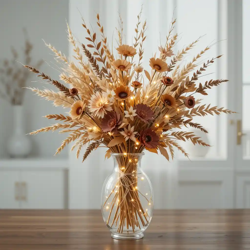 Place dried flowers, wheat stalks, and leaves in a vase, then add battery-operated fairy lights for an elegant, autumn-inspired display.
