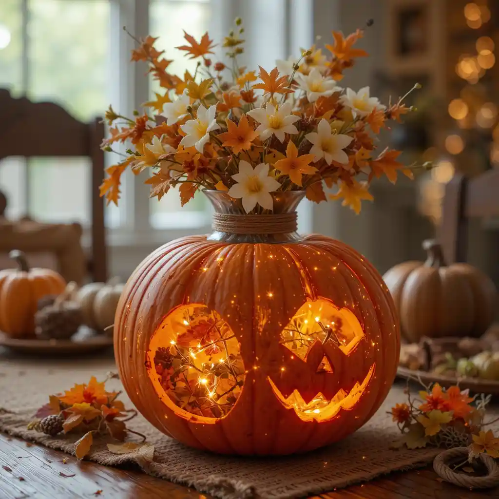 Carve out a pumpkin, place a glass jar or vase inside, and fill it with fairy lights. This creates a seasonal centerpiece that glows beautifully through the carved openings.
