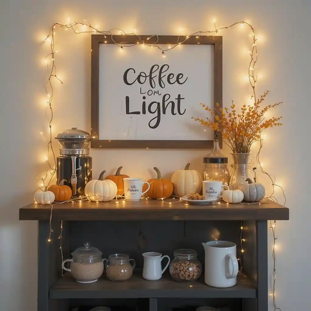 Decorate your coffee bar or drink station with fairy lights intertwined with mini pumpkins and mugs. It creates a welcoming area for morning coffee or evening cocoa.
