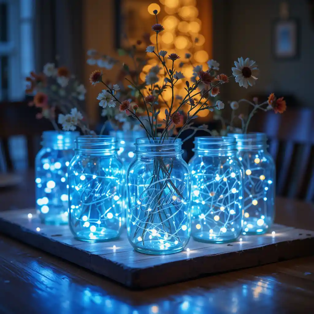 Fill mason jars with string lights for a farmhouse-inspired centerpiece. Place them on your dining table, kitchen shelf, or mantel to add a gentle, warm illumination to any corner of your home.