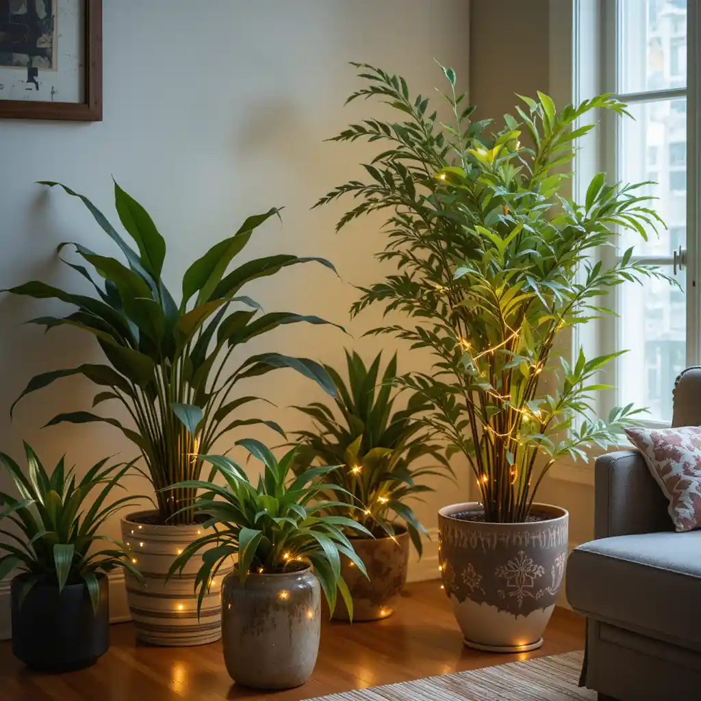 Give your houseplants an autumn upgrade by wrapping fairy lights around their stems or placing them at the base. The combination of greenery and warm light creates a lively yet cozy seasonal look.