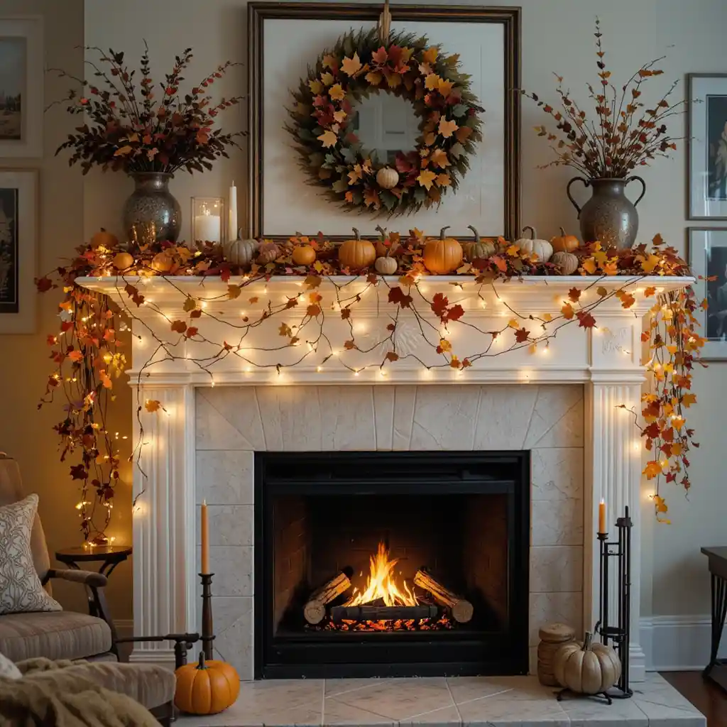 Decorate your mantel with fall foliage, mini pumpkins, and fairy lights. Let the lights cascade slightly over the edge for a soft, romantic glow that draws attention to your fireplace area.