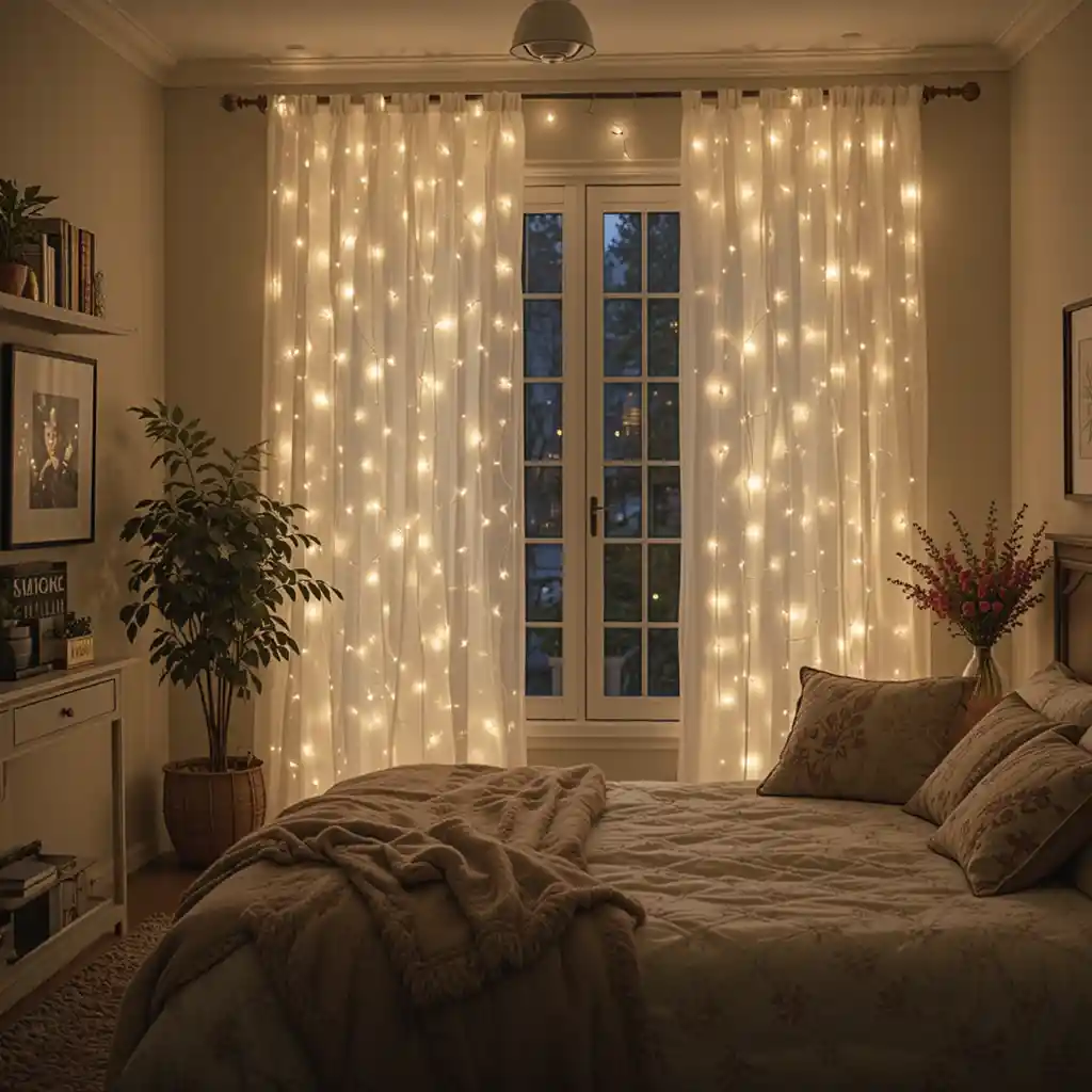 Hang sheer white curtains in front of fairy lights to create a dreamy, diffused glow. This setup works perfectly for a bedroom or reading nook during fall evenings.