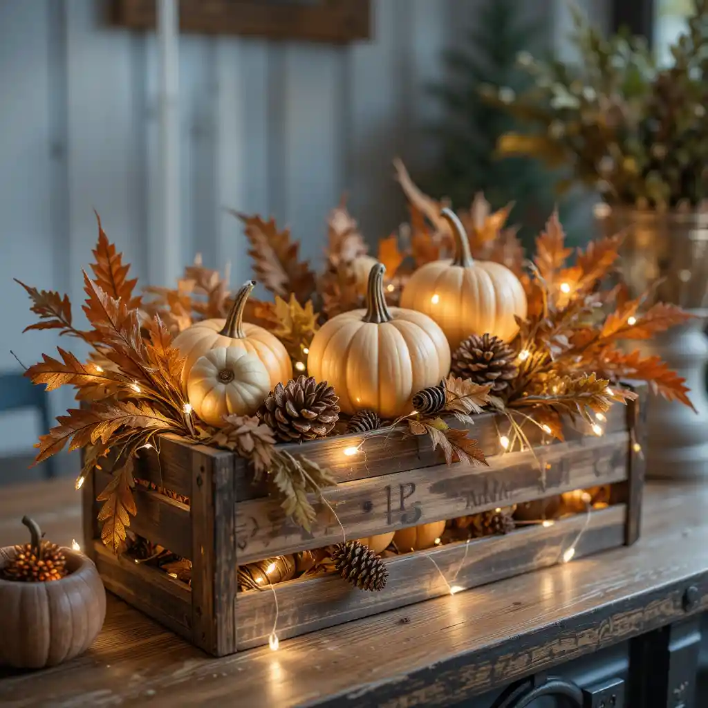 Place mini pumpkins, pinecones, and dried leaves in a rustic wooden crate, then weave fairy lights through the arrangement. It’s an easy DIY décor idea for entryways or living rooms.