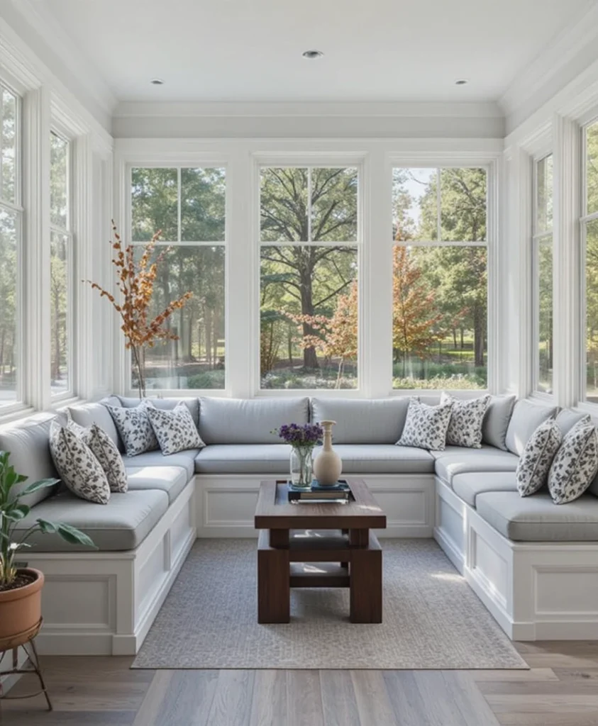 Custom bench seating maximizes space while maintaining a streamlined look. Upholstered cushions add comfort without visual clutter. This modern sunroom idea 2026 works well for compact homes seeking smart, stylish solutions.