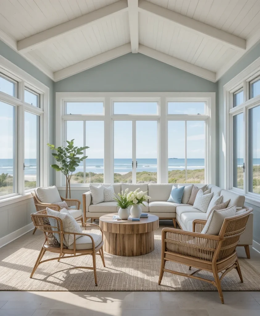 Soft blues, sandy neutrals, and natural textures bring a breezy coastal feel into a modern design. Large windows emphasize views and light. This modern sunroom idea 2026 is relaxed yet refined, ideal for homes near water or inspired by it.