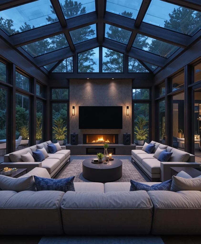 Designed for leisure, this sunroom includes modular seating, integrated speakers, and ambient lighting. The layout supports both relaxation and social interaction. As a modern sunroom idea 2026, it reflects modern lifestyles centered on comfort and connection.