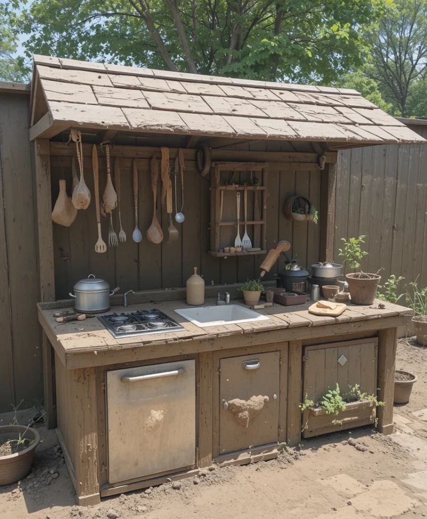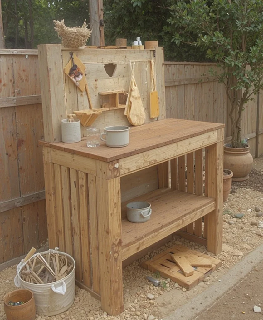 I love using old wooden pallets to create a naturally weathered mud kitchen. The rough textures give it a countryside feel, and it’s incredibly budget-friendly. I usually sand it slightly but keep the imperfections for character. Adding hooks for utensils makes it both practical and visually appealing.
