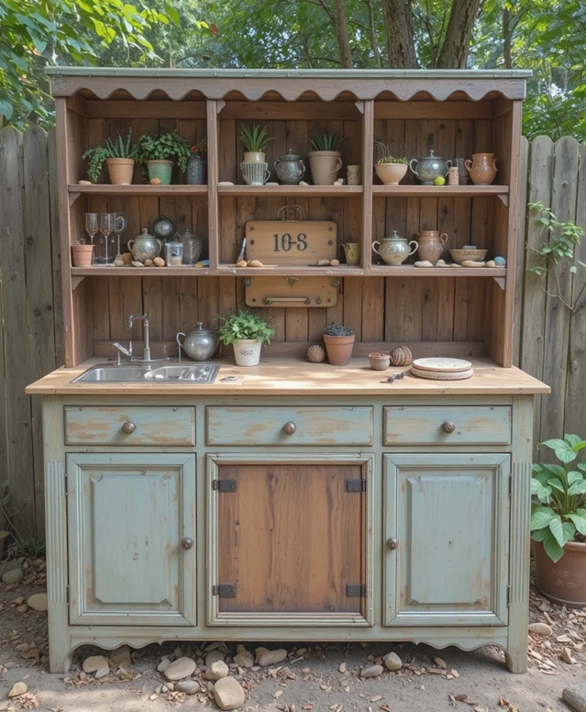 Old dressers or cabinets can be transformed into stunning mud kitchens. I remove unnecessary parts and adapt the structure for outdoor use. It gives new life to unused furniture. Plus, it adds a vintage touch.