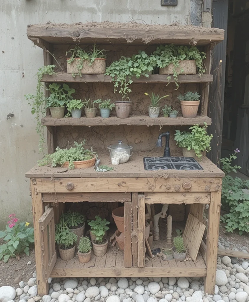 I like integrating planters directly into the kitchen design. Herbs or small plants can grow alongside the play area. It teaches kids about nature while enhancing the aesthetic. This Mud Kitchen DIY feels both playful and educational.