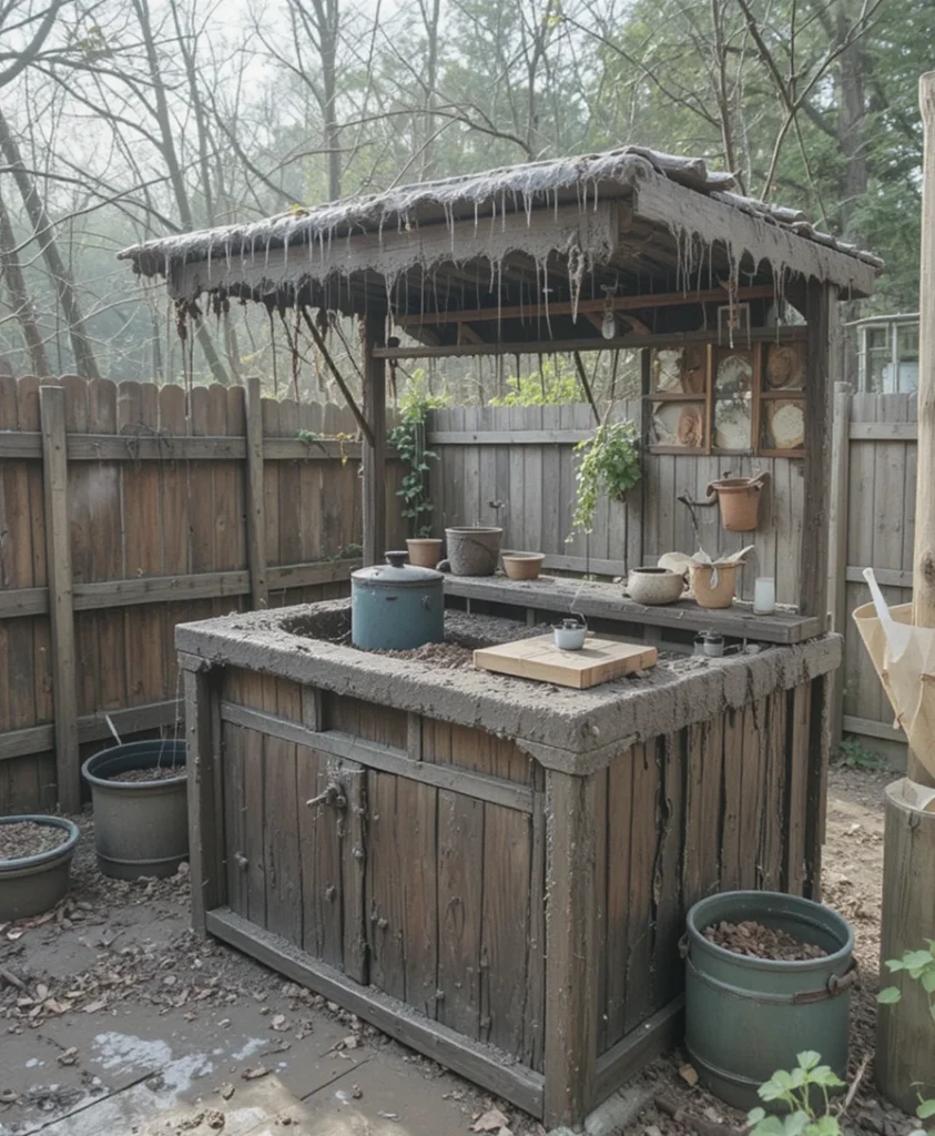Weather can be unpredictable, so I sometimes add a small roof or canopy. It protects the setup from rain and harsh sun. This ensures the mud kitchen stays usable year-round. It’s a practical upgrade that extends its lifespan.