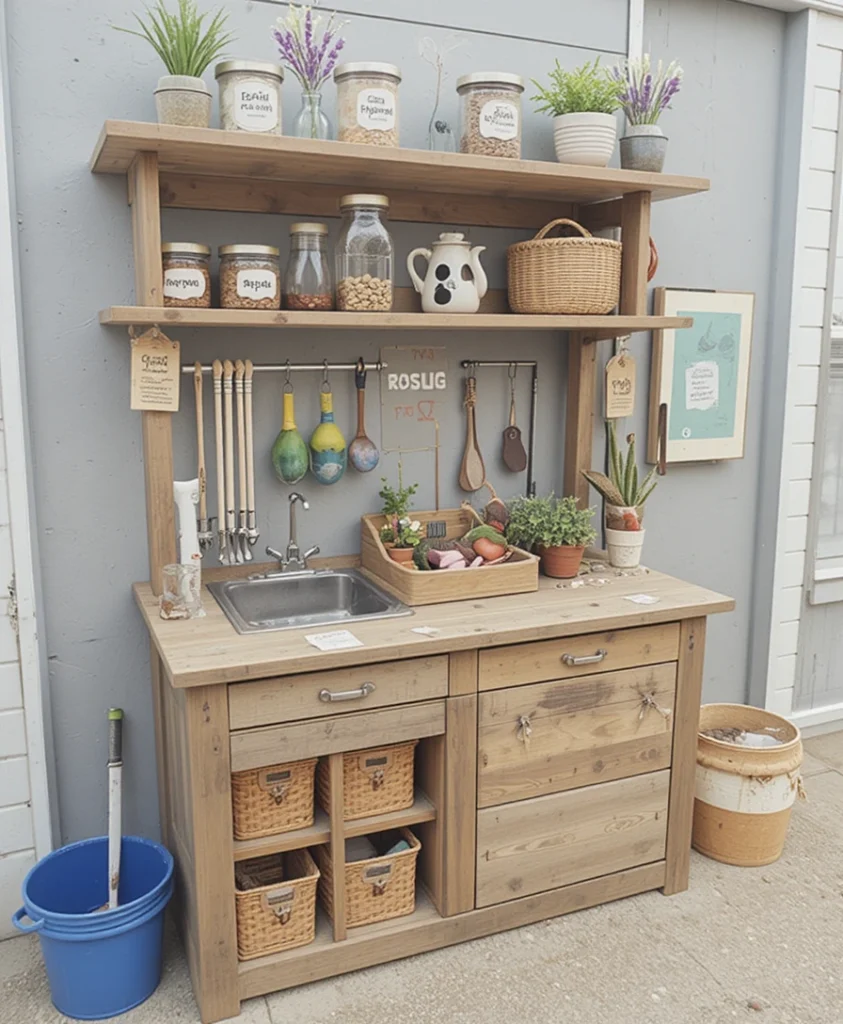 Storage doesn’t have to be boring. I add labeled jars, hanging baskets, and sliding drawers. It keeps everything organized while adding visual appeal. A well-organized Mud Kitchen DIY makes playtime smoother and more enjoyable.