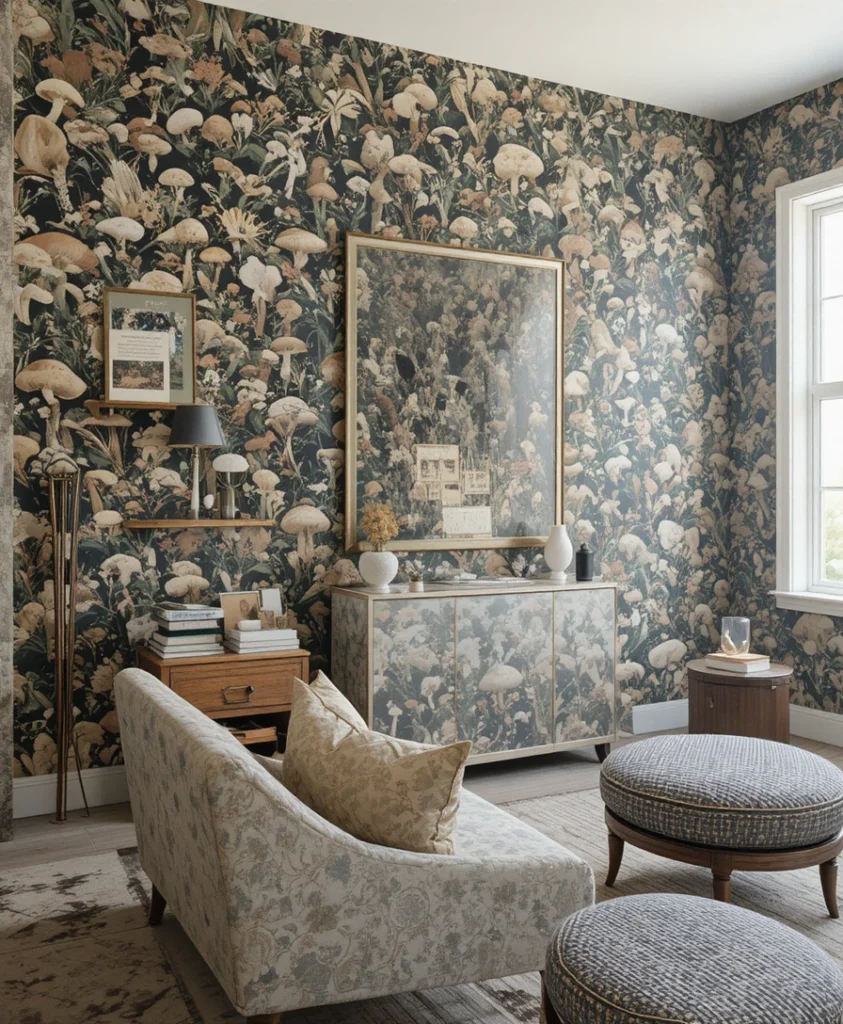For a bold transformation, I’ve experimented with mushroom-patterned wallpaper on an accent wall. It completely changes the room’s personality. This mushroom decor choice is perfect when I want to create a space that feels immersive and unique.