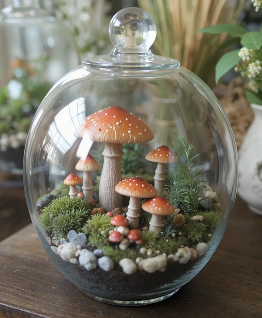 I love building small terrariums with miniature mushroom accents inside. It feels like creating a tiny world within glass. This mushroom decor idea is both creative and calming, and it adds a living, breathing element to any surface.