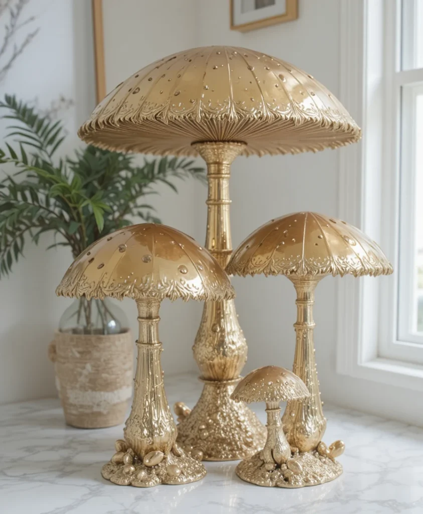 For a more elevated look, I sometimes choose metallic mushroom decor pieces in gold or brass finishes. They reflect light beautifully and add a touch of luxury. It’s a great way to make mushroom decor feel more sophisticated.
