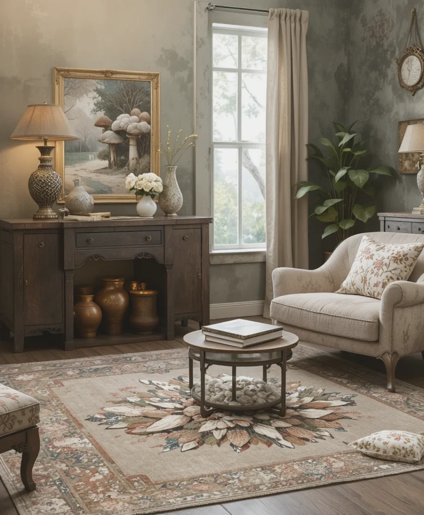 A rug with subtle mushroom motifs can tie an entire room together. I prefer designs that blend softly into the pattern rather than stand out too boldly. This mushroom decor idea adds warmth underfoot while still keeping the aesthetic cohesive.