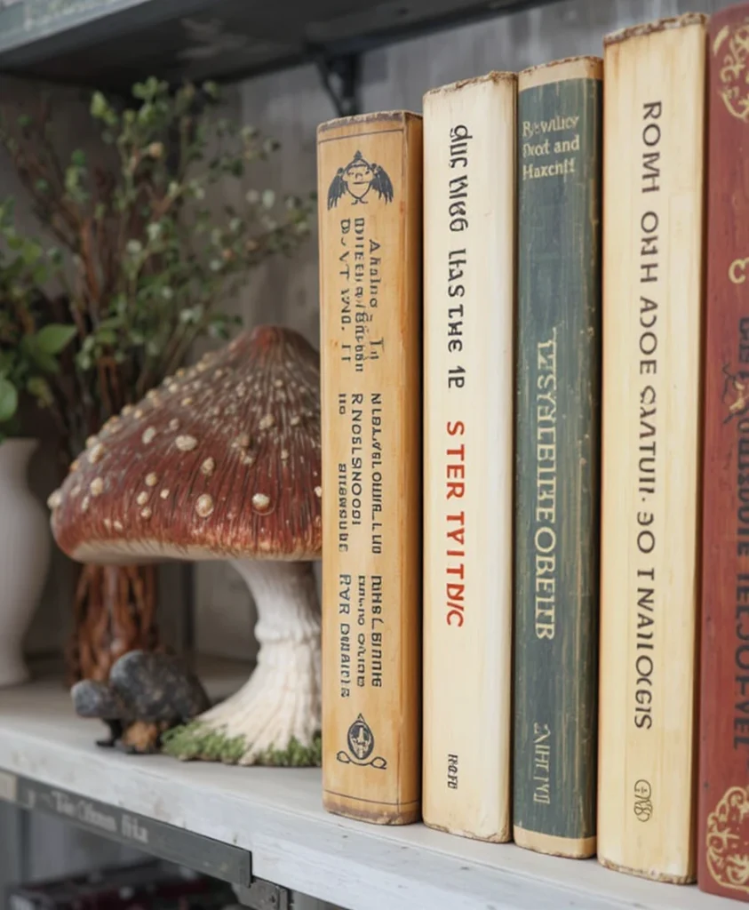 On my bookshelf, I use mushroom-shaped bookends to add character. They’re both practical and decorative. This mushroom decor idea works especially well in reading corners, where every detail contributes to the overall atmosphere.