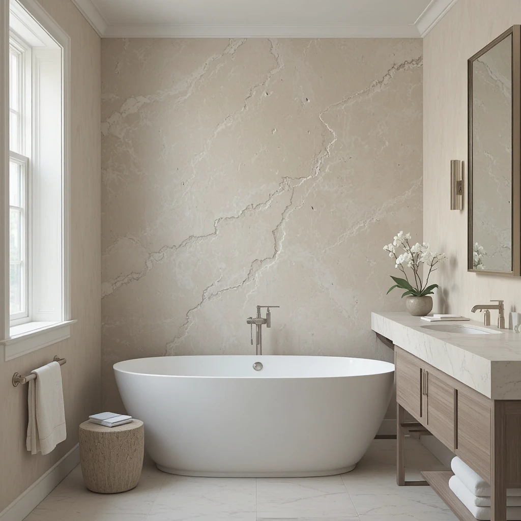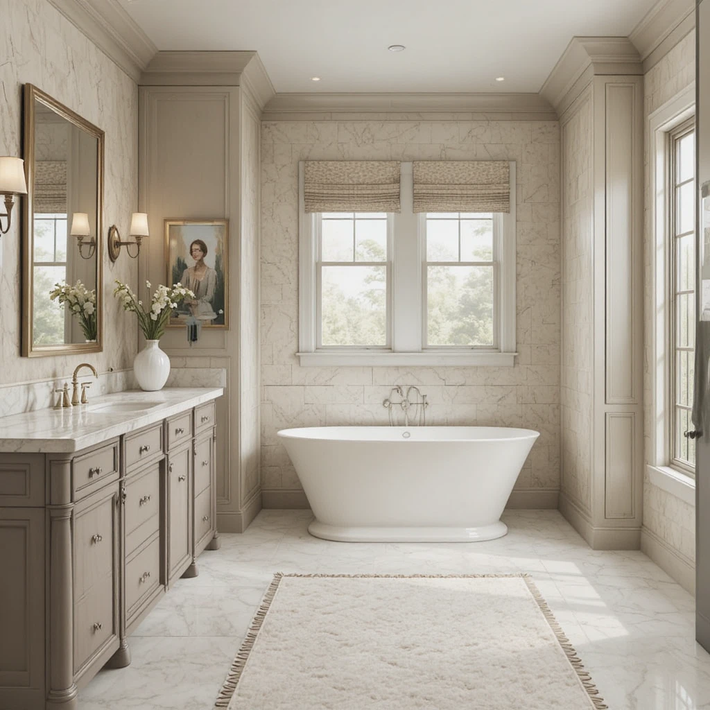 Designing a neutral large bathroom is about balancing texture, tone, and tranquility.