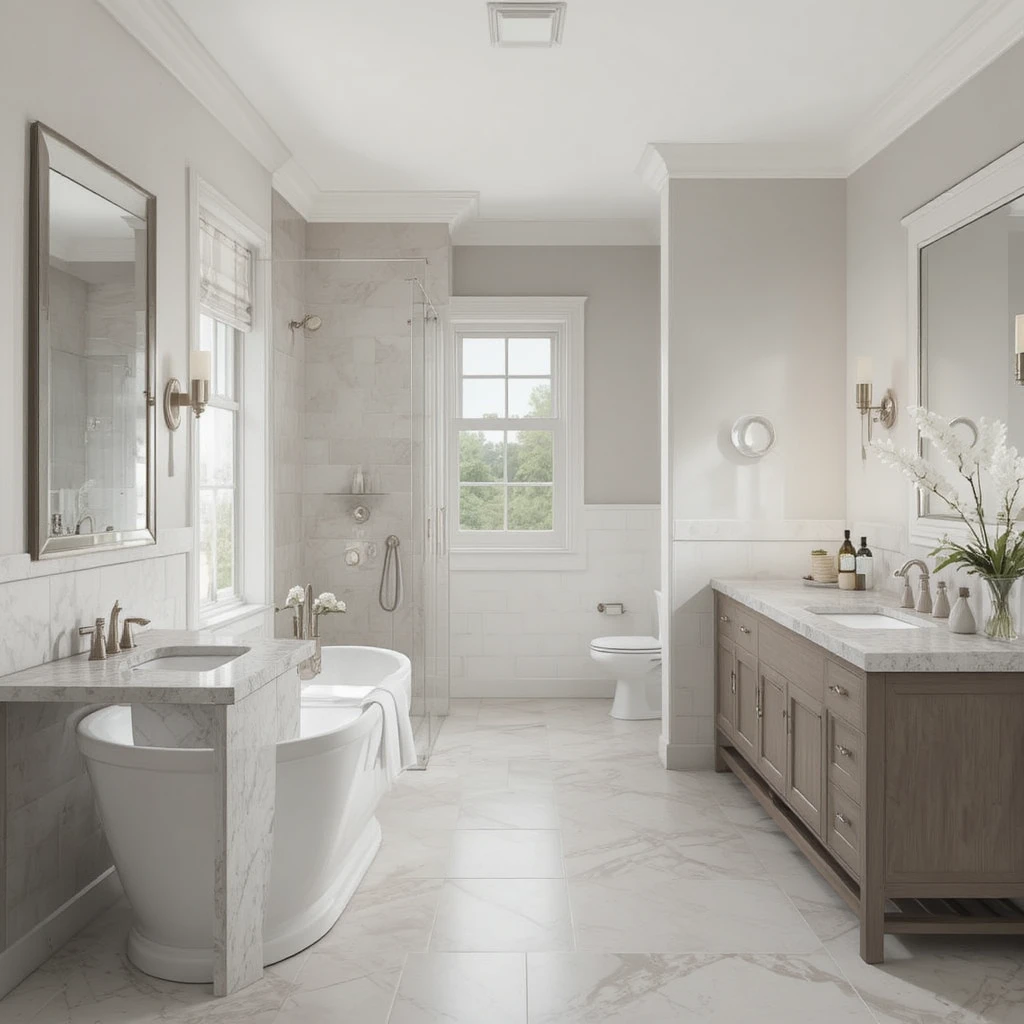 Combine grey and beige tones for a modern twist on neutrals. This palette delivers depth without overpowering the calmness, perfect for large bathrooms that aim for soft elegance.