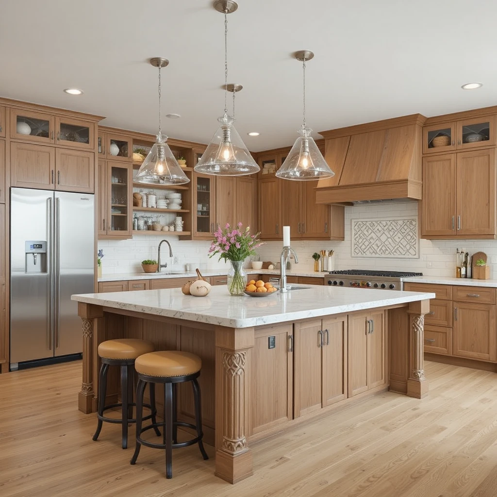 Glass-front oak cabinets add sophistication to oak kitchen ideas 2026. Frosted or lightly tinted glass breaks up solid wood surfaces while maintaining cohesion. This design allows light to flow through the space and adds a refined visual layer.