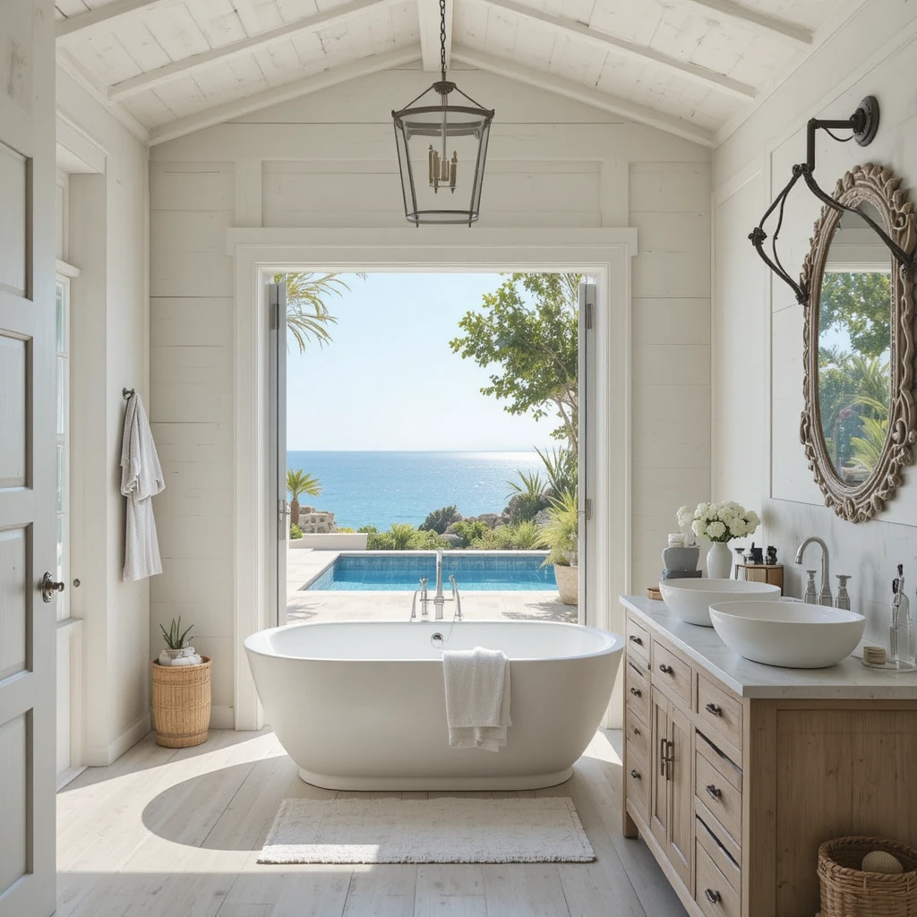 Bring the seaside home with an open air bathroom facing the ocean or poolside. Whitewashed walls, light wooden tones, and nautical décor accentuate the coastal charm while the ocean breeze rejuvenates your spirit.