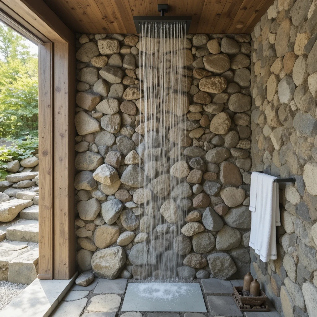 Install a cascading waterfall-style showerhead surrounded by natural stones for an authentic open-air experience. The sound of flowing water blends harmoniously with the outdoors, creating a refreshing, nature-driven ambiance.