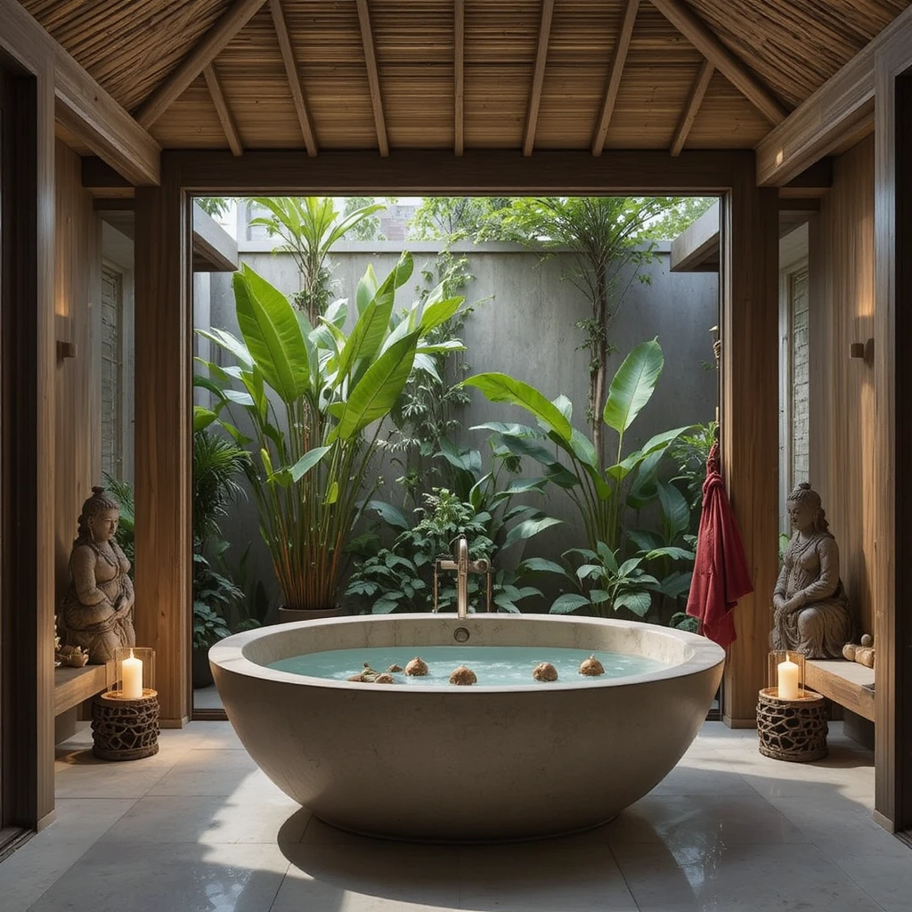 Embrace the tropical Balinese concept with carved stone statues, bamboo accents, and floating candles. This open air bathroom design invites peace, spirituality, and a strong connection to the elements of earth and water.