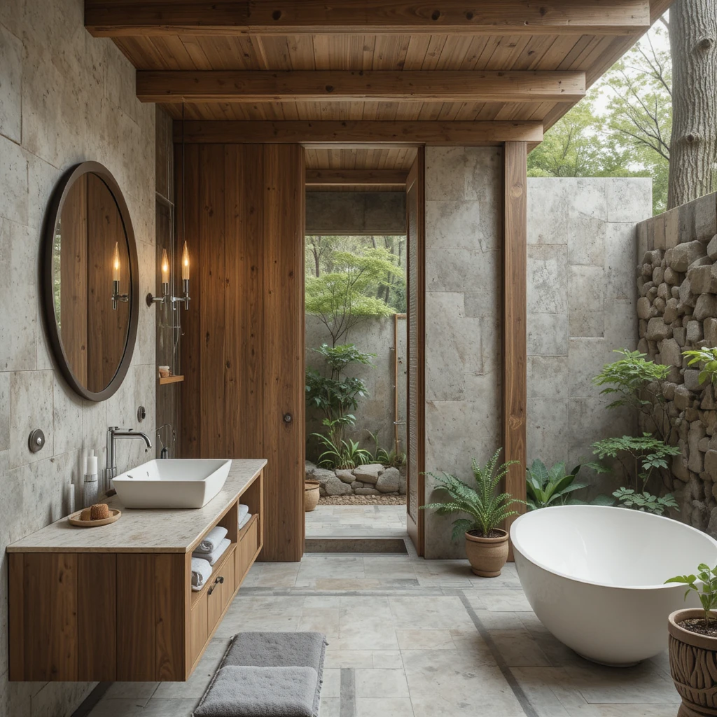 For a dramatic contrast, create an open air bathroom inspired by desert tones. Use sand-colored stone, succulents, and terracotta pots to craft a serene yet bold space that feels warm, airy, and grounded in nature.