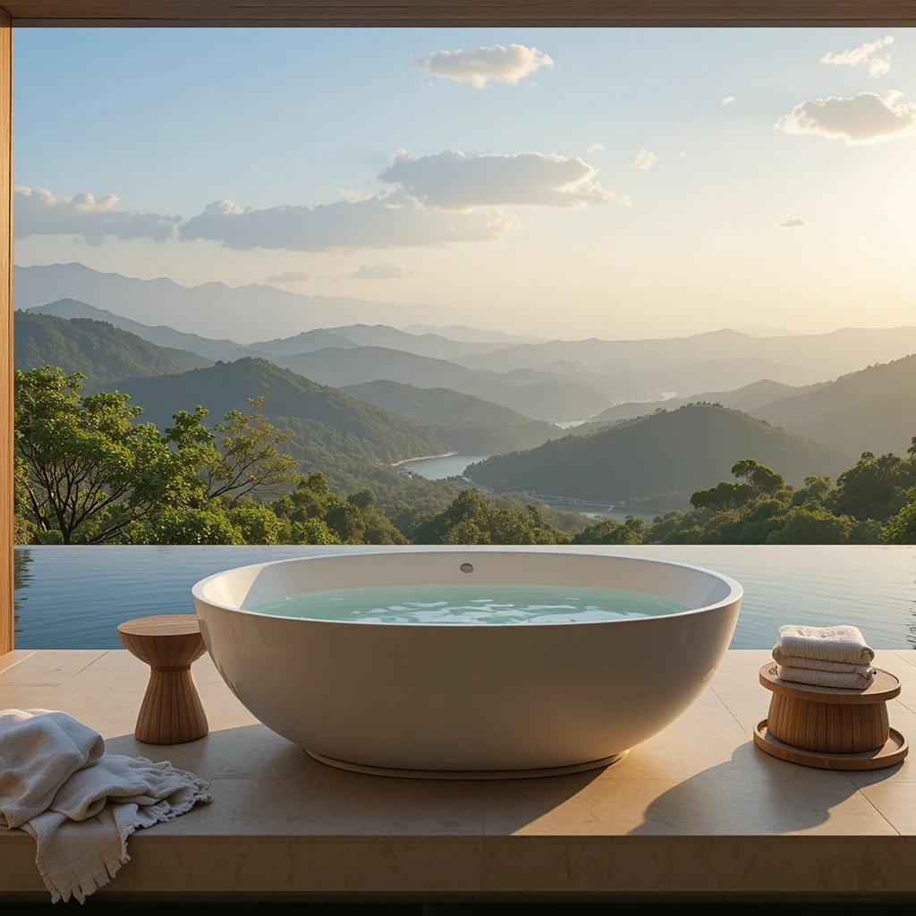 Place your tub on an elevated platform with an infinity edge that overlooks a lush view. The seamless water line and open horizon create a luxurious and cinematic open air bathroom that feels infinite and liberating.