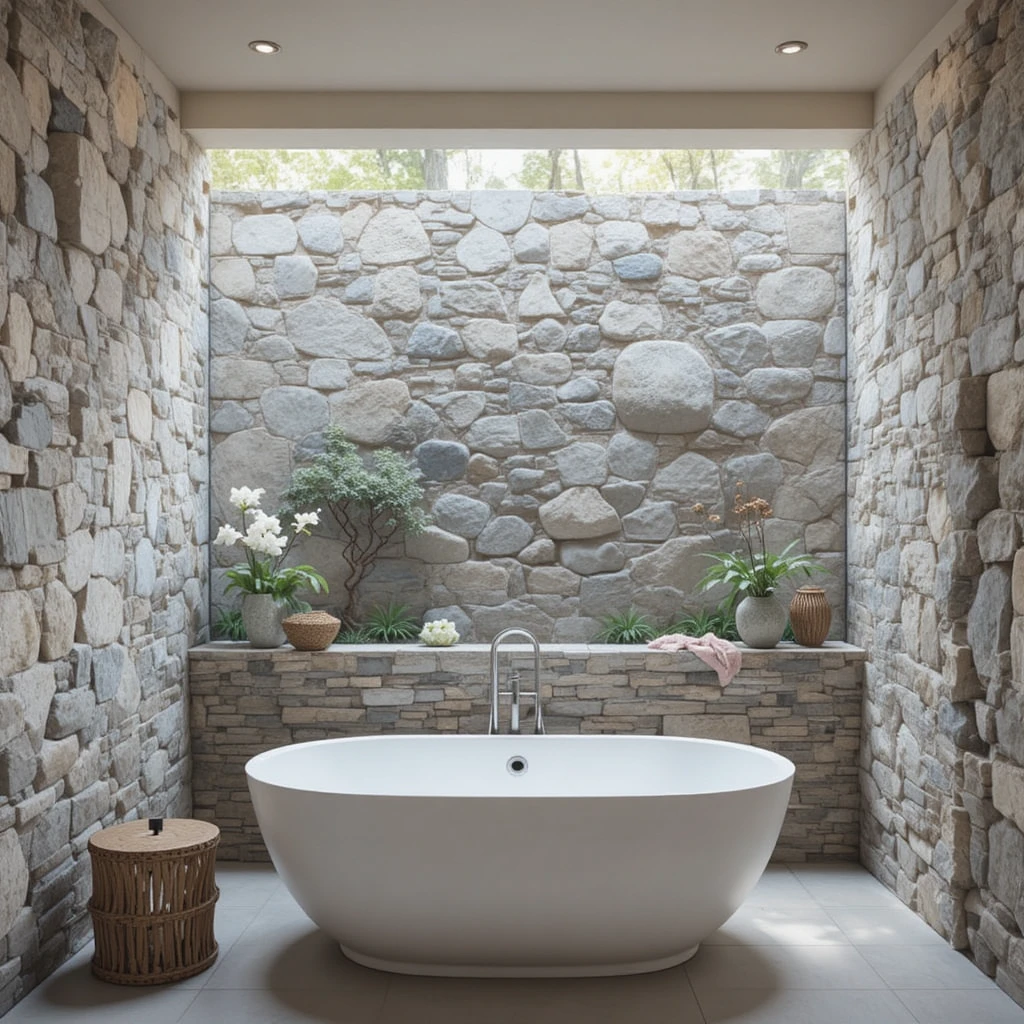 Add an earthy touch with stone walls that offer both texture and privacy. Pair them with a freestanding tub and subtle lighting for a natural yet luxurious open air bathroom experience that blends rustic charm with modern sophistication.