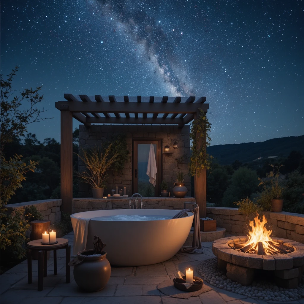Install subtle pathway lights and a warm fire pit nearby for evening baths under the stars. Your open air bathroom becomes a magical space to unwind, meditate, and reconnect with yourself under the vast night sky.