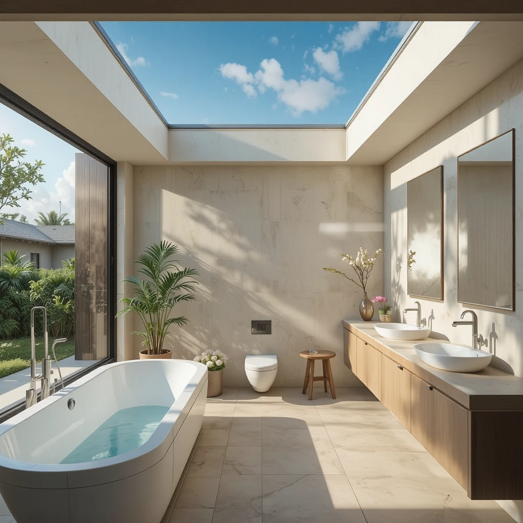 If you prefer partial exposure, design your open air bathroom with a large skylight. This way, you can enjoy the warmth of sunlight and the glow of moonlight while maintaining privacy and a luxurious indoor-outdoor balance.