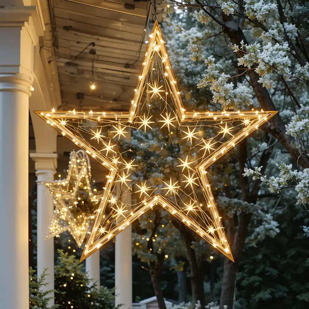 Suspended lighted star decorations on trees or porch ceilings add a dreamy glow. They bring height and elegance while filling empty outdoor spaces beautifully.