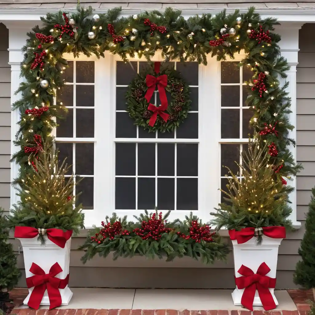 Dress up your window planters with faux pine branches, berries, bows, and twinkling lights. This small touch creates a layered and polished holiday look.