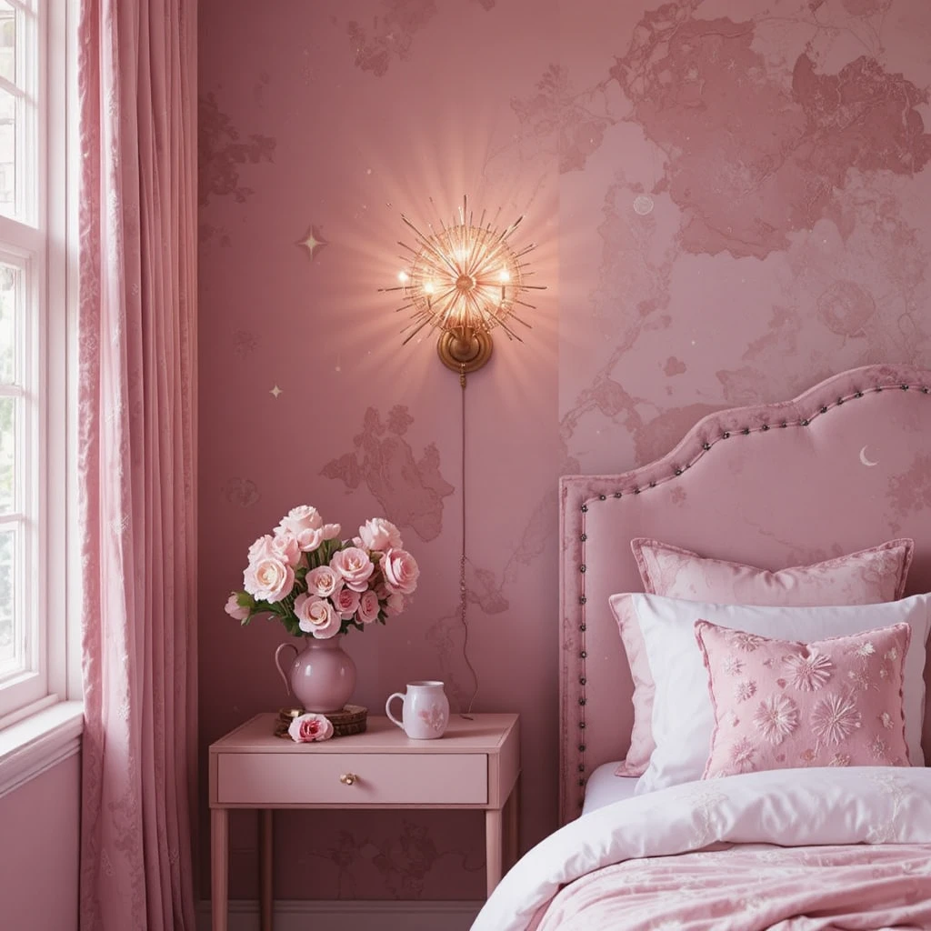 Illuminate your walls with starburst sconces in gold or rose-gold finishes. These art-deco-inspired pieces not only add functional lighting but also bring a celestial sparkle that blends sophistication with the pink dreamy tone of your decor.