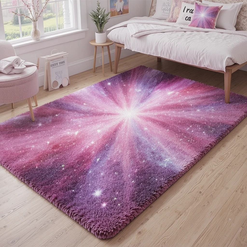 Lay a plush rug featuring nebula or galaxy-inspired prints with pink, lavender, and silver tones. It anchors your space and adds an imaginative element, pulling the celestial theme together from the ground up with warmth and flair.