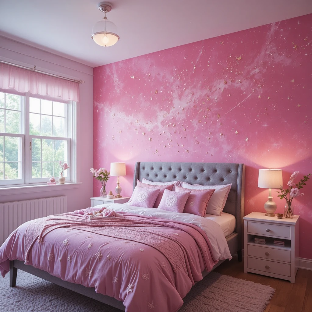 Transform one wall into a masterpiece with pink ombre paint and scattered fine glitter to mimic star dust. This accent wall adds depth, motion, and light play, instantly making your bedroom feel like a cosmic dreamscape.