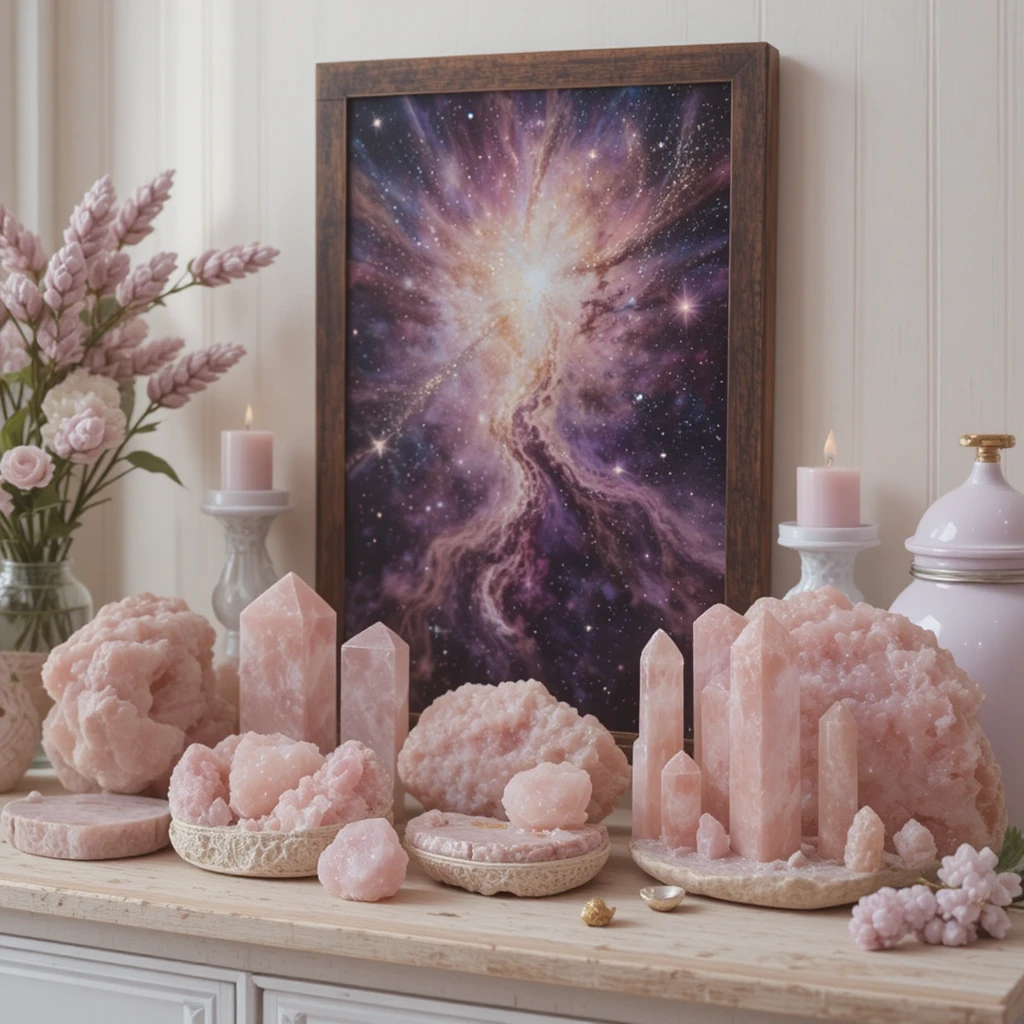 Place rose quartz, moonstone, or pink amethyst crystals on your nightstand or shelves. Their gentle energies and shimmering tones perfectly complement celestial themes while infusing your space with calm, radiant energy.