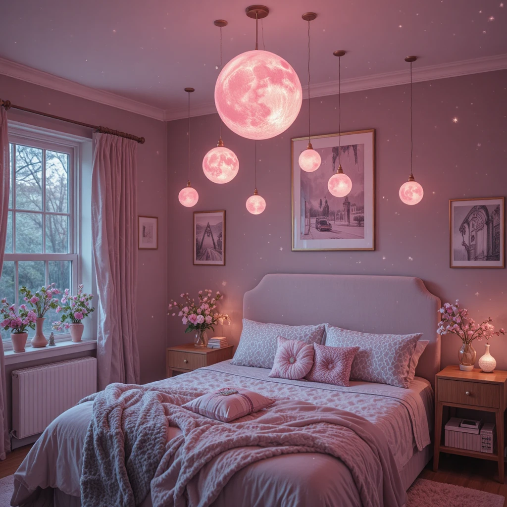 Install pendant lights shaped like moons or miniature planets, glowing in soft pink tones. Suspended over your bed or reading nook, these cosmic lights add elegance and a hint of mystique — like your own universe orbiting above.
