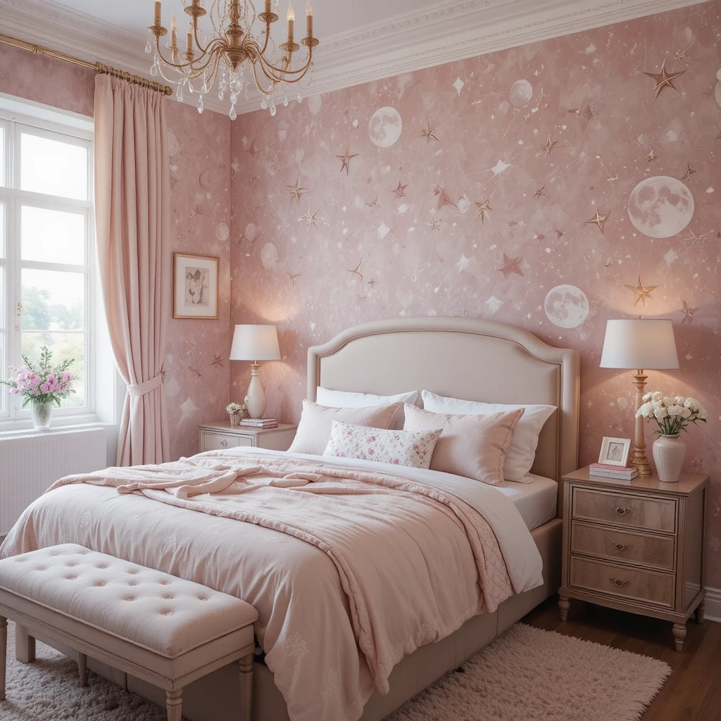 This ethereal blend of blush tones and starlit designs captures both serenity and mystery, creating a dreamy retreat that feels otherworldly yet cozy.