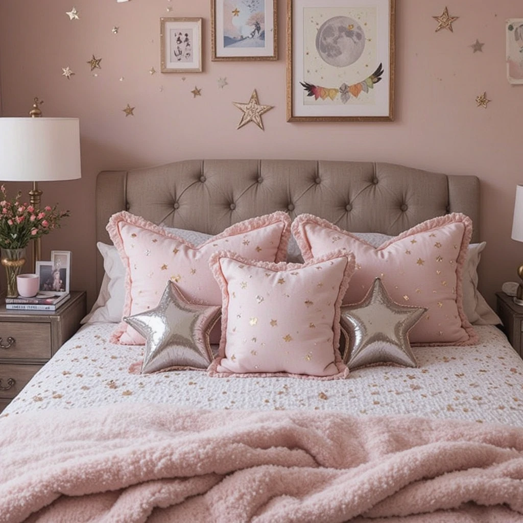 Scatter your bed or seating area with metallic star and moon-shaped pillows in pale pink and silver. These accents tie the celestial theme together while adding plush comfort and a twinkle of playfulness.
